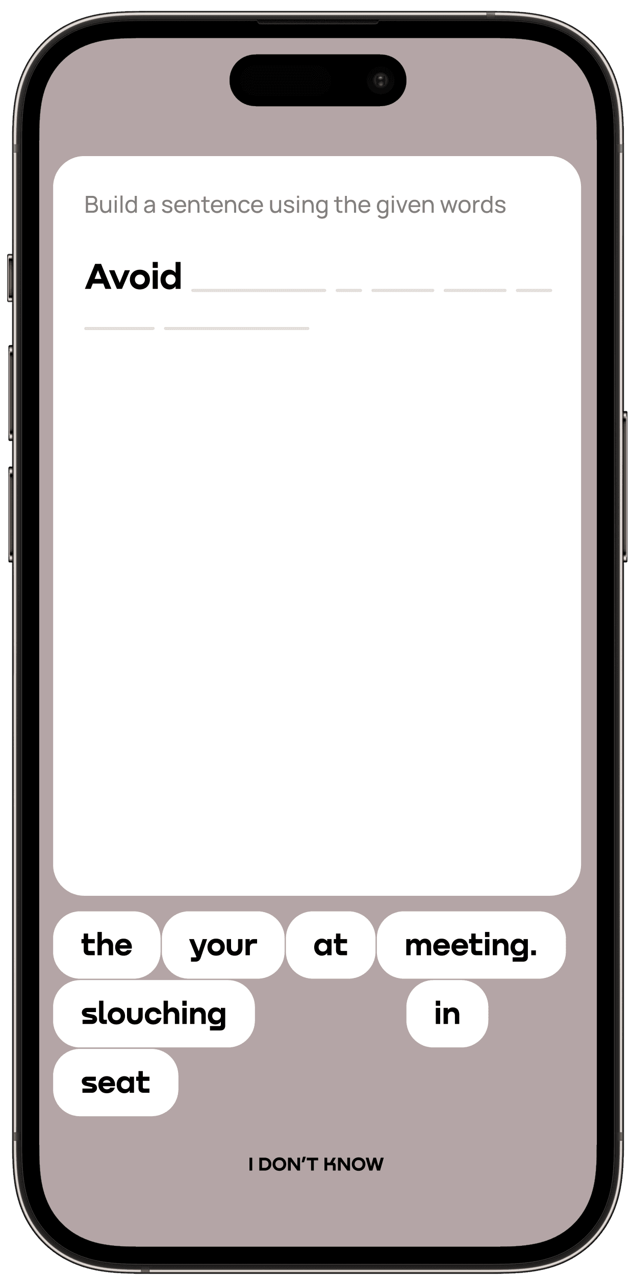 After you answer a few quick questions about your learning goals, you’ll get access to an English course at your current level. The course will include grammar, vocabulary, and language use, such as English tenses exercises. You can also find specific topics such as business English or TV shows as separate courses. Every module includes practice with different language aspects - you’ll learn to use words, discover helpful phrases, apply grammar rules, and so on.
