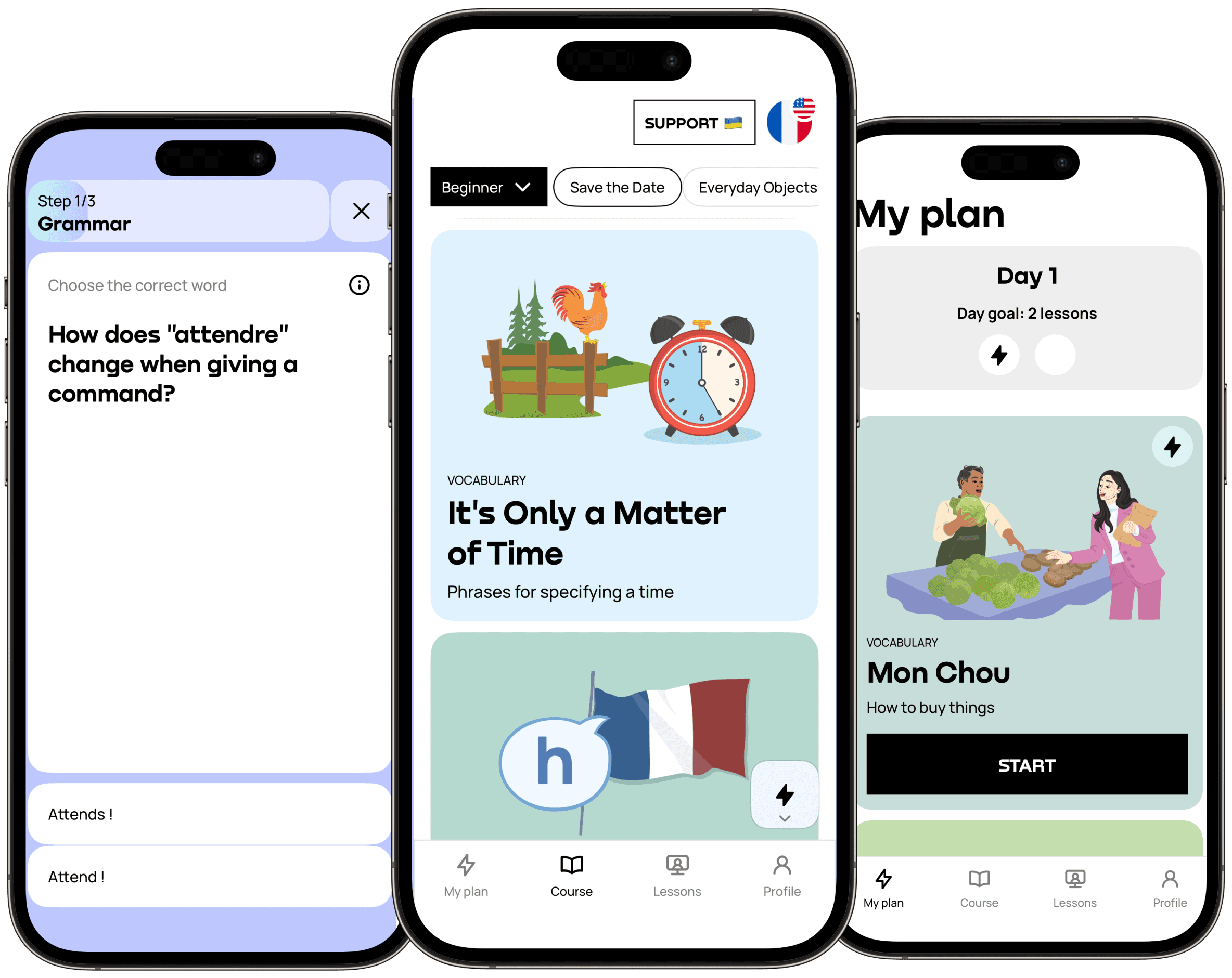 Forget about one-size-fits-all. With Promova, you get to choose your own learning path based on your French language level and topics of interest (incl. travel, business, and more).