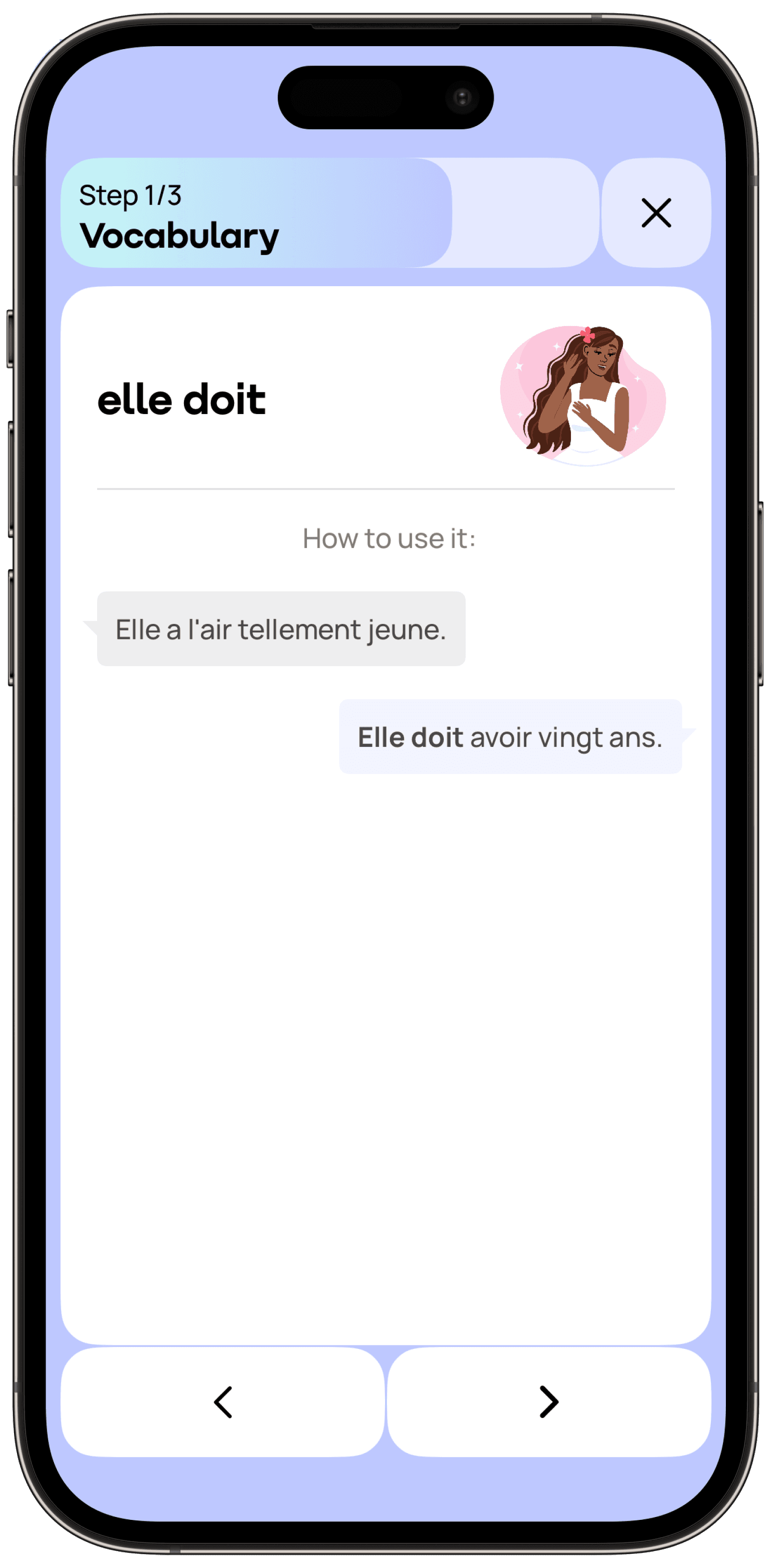 Promova offers a wide variety of learning formats for the French language. You can complete French listening exercises, practice your speaking, dive into themed French courses, or have fun with Promova’s interactive daily lessons.