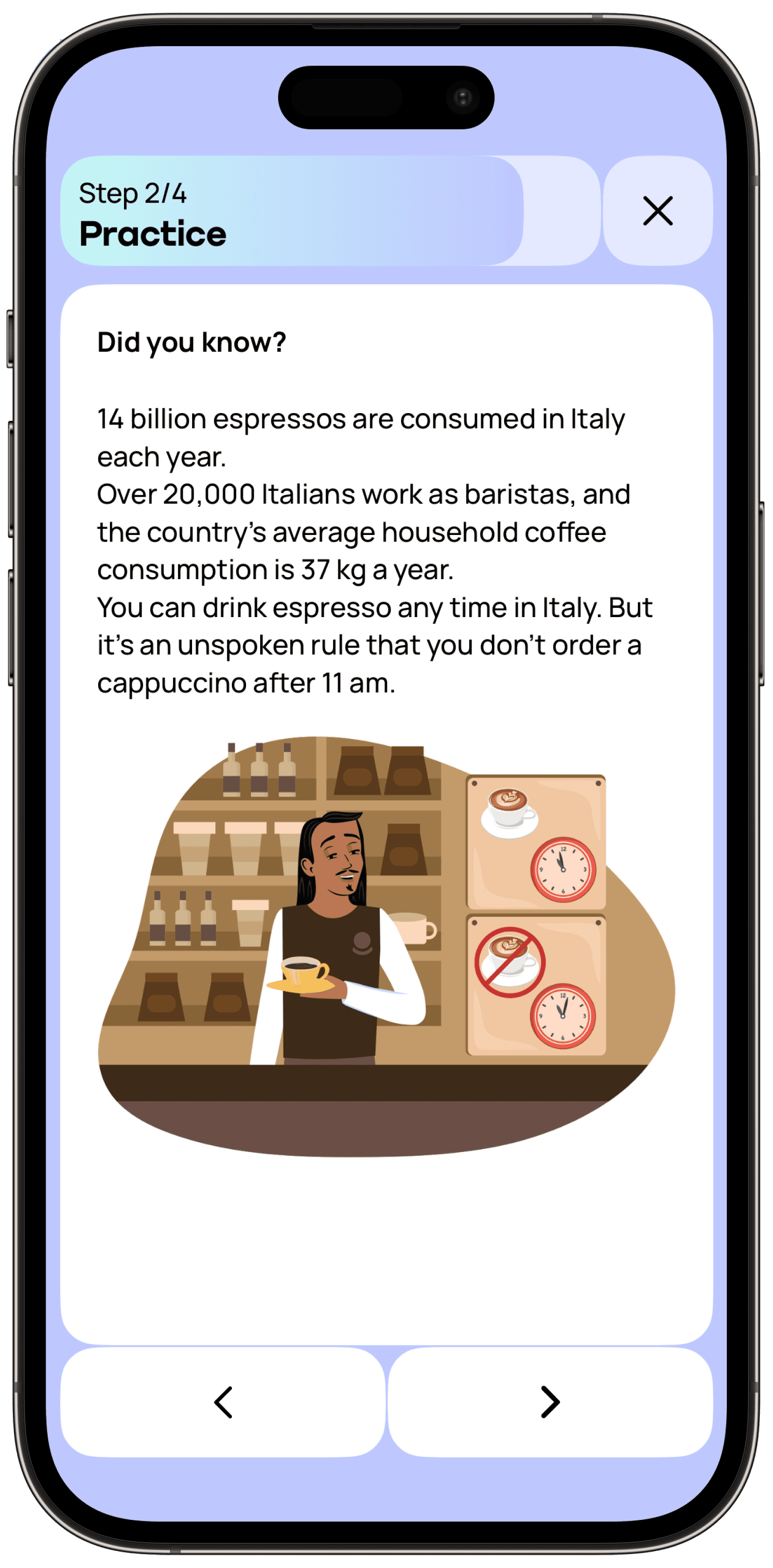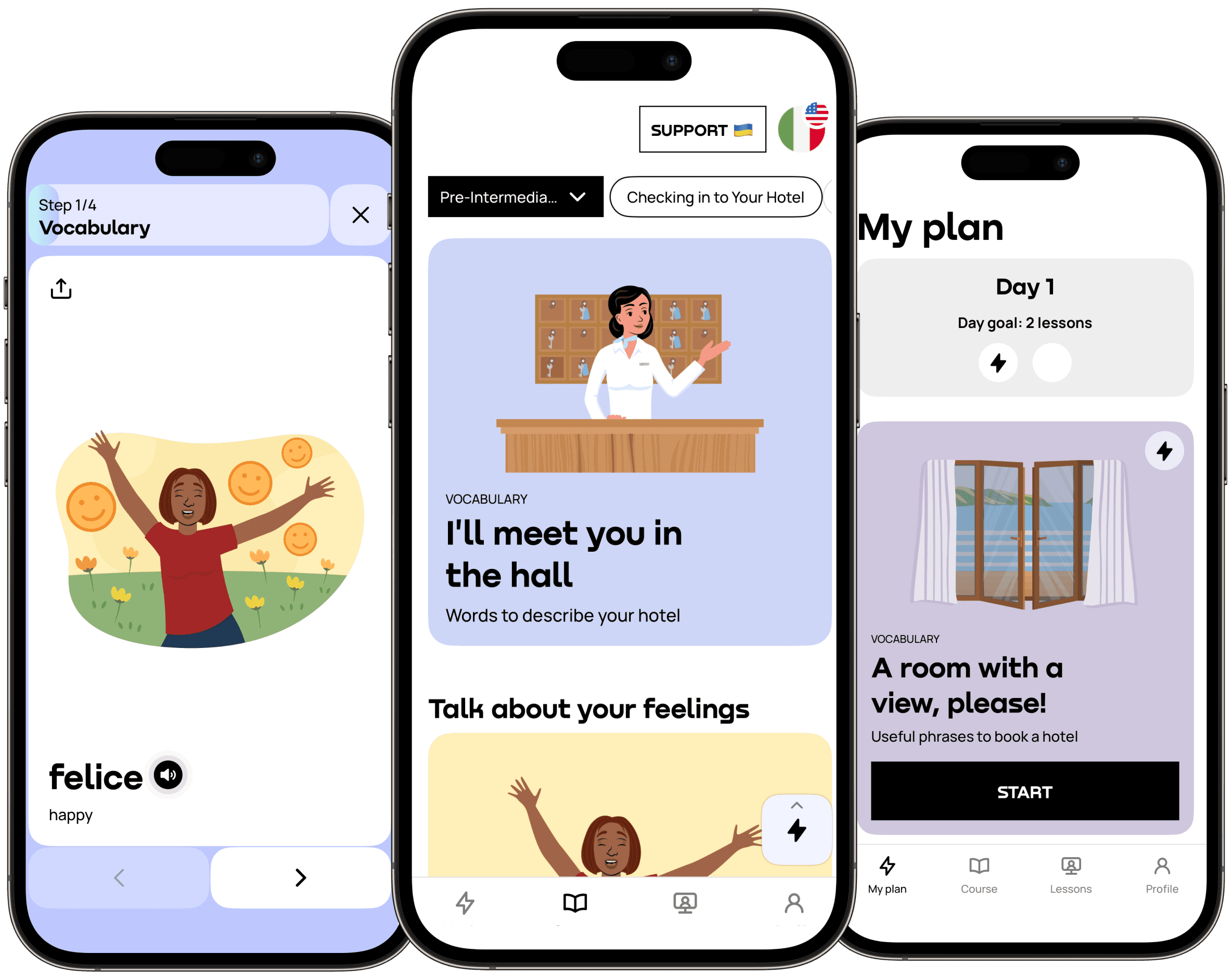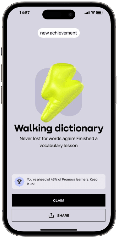 Promova teaches languages through a speaking-first approach. This means that we’ll help you to start actively using Italian from day one. Even if it’s just simple expressions and basic small talk, you can start speaking Italian with Promova pretty much right away.